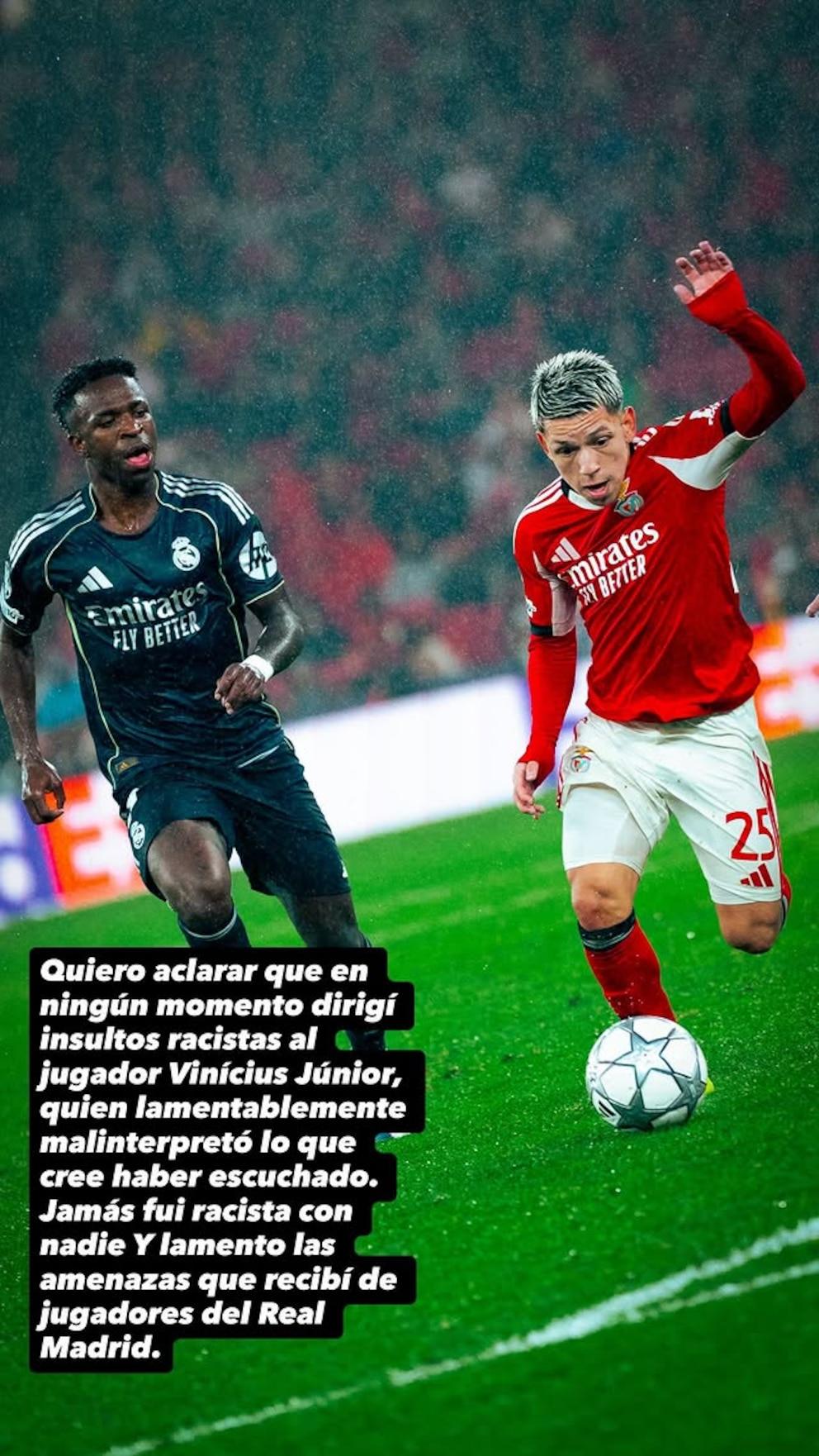 “I want to clarify that at no time did I direct racist insults at the player Vinícius Junior, who unfortunately misinterpreted what he thinks he heard. I was never racist with anyone,” the former Vélez wrote in a story on his Instagram account.